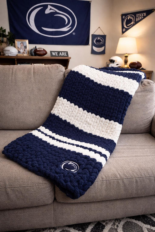 Bring a special touch into your home with this custom hand-knit chunky throw, hurdle stitched in taupe and ivory, or your choice color combination . Made with ultra-soft, premium yarn, this plush throw is perfect for snuggling up and staying warm, stylish home décor, and thoughtful gifting. I am a sports fanatic, so I am happy to create a blanket with any colors you’d like to support your favorite team. Message me and we can plan it together! Embroidered logos for just about any team available, as well!!